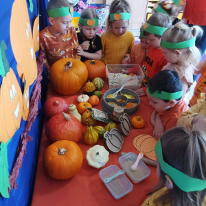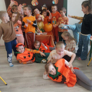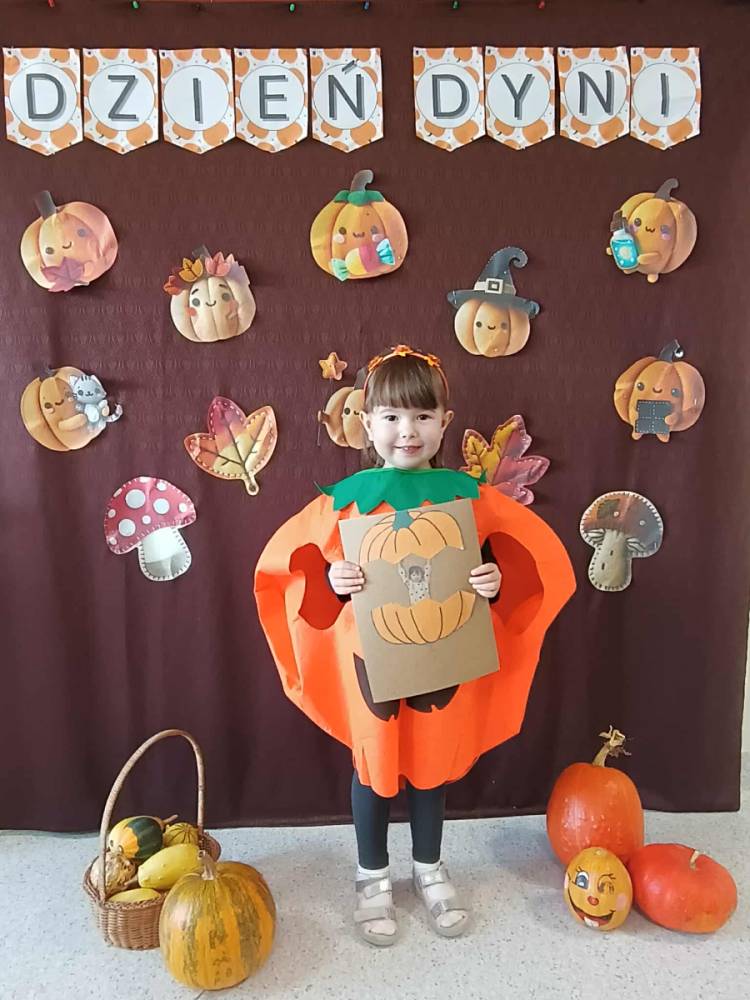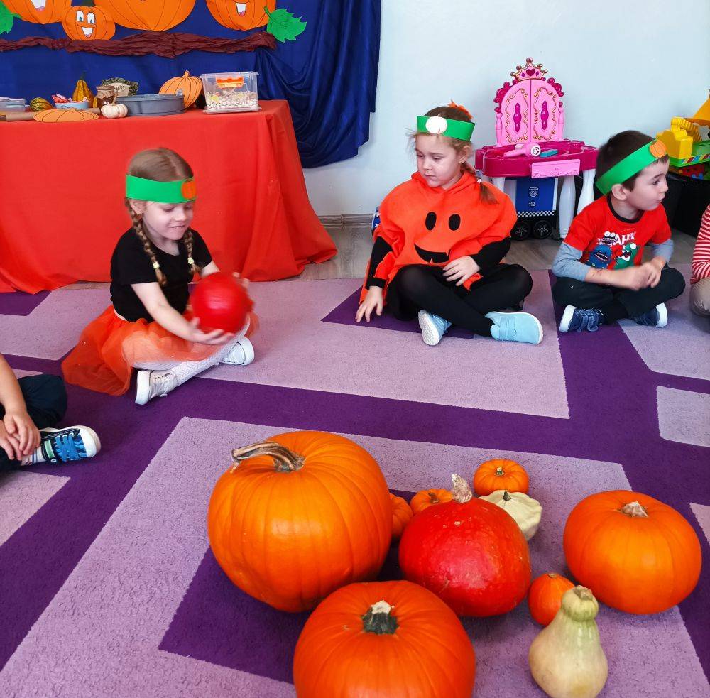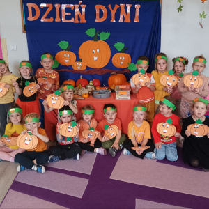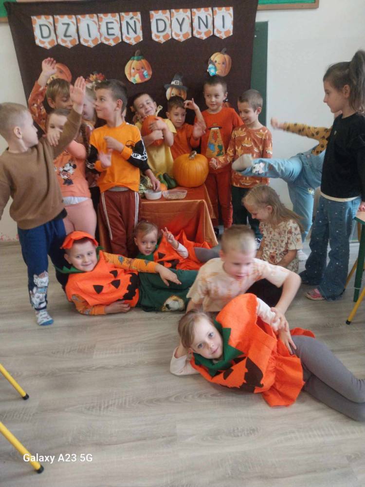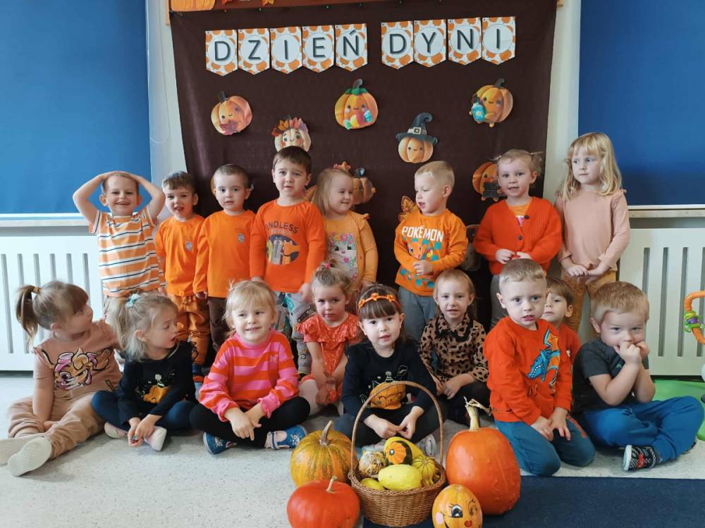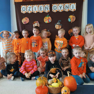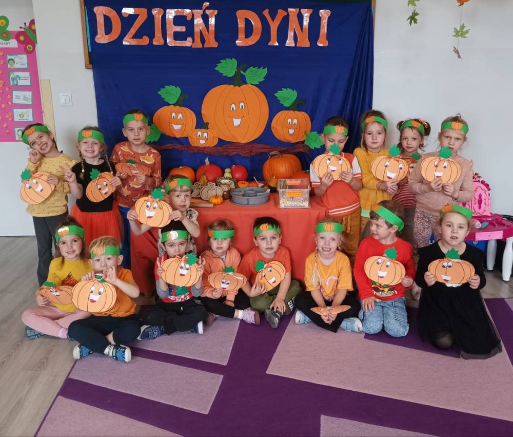 W ostatnim tygodniu października w naszym przedszkolu odbył się „Dzień Dyni”. Była to świetna okazja do poznania wielkiej różnorodności dyń i wzbogacenia wiedzy na ich temat. „Święto Dyni” rozpoczęliśmy wspólnym tańcem oraz rozmową na temat dyni. Dzieci dowiedziały się, że jest ona bardzo zdrowym warzywem i można z niej przygotować wiele smacznych dań. W poszczególnych grupach odbyły się ciekawe zajęcia i zabawy m.in.: pływająca dynia, przeliczanie dyń, szeregowanie od największej do najmniejszej, dyniowy slalom, podaj dynię. Nie zabrakło tańców, śpiewów, zabaw muzyczno-ruchowych oraz kreatywnych prac plastycznych. Dużo radości sprawił dzieciom udział w sesji zdjęciowej w stroju dyni. Zwieńczeniem tego dnia było przygotowanie gofrów i deserów z dyni, które nasze przedszkolaki spałaszowały ze smakiem. Ten dzień przyniósł wiele niezapomnianych wrażeń, ciekawości, odkrywania i zabawy.