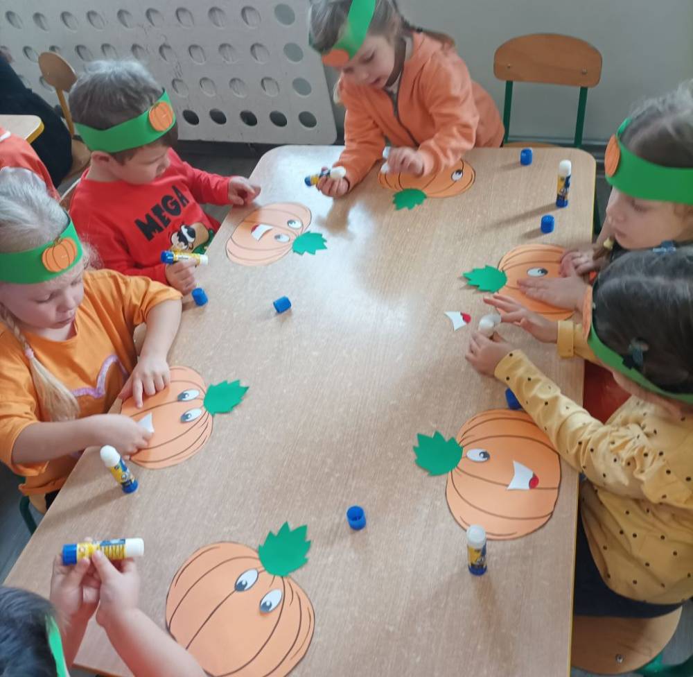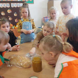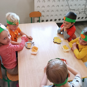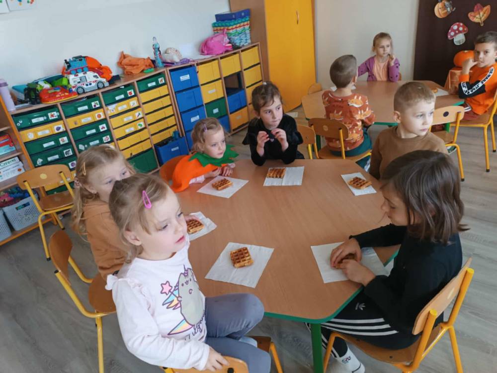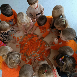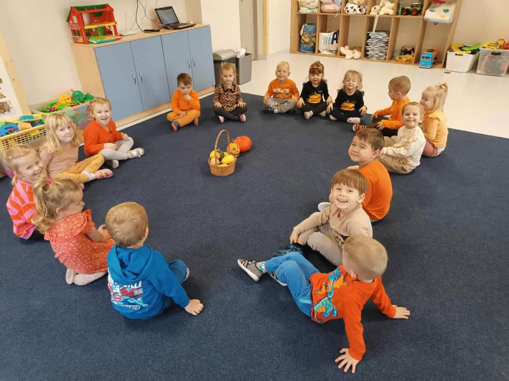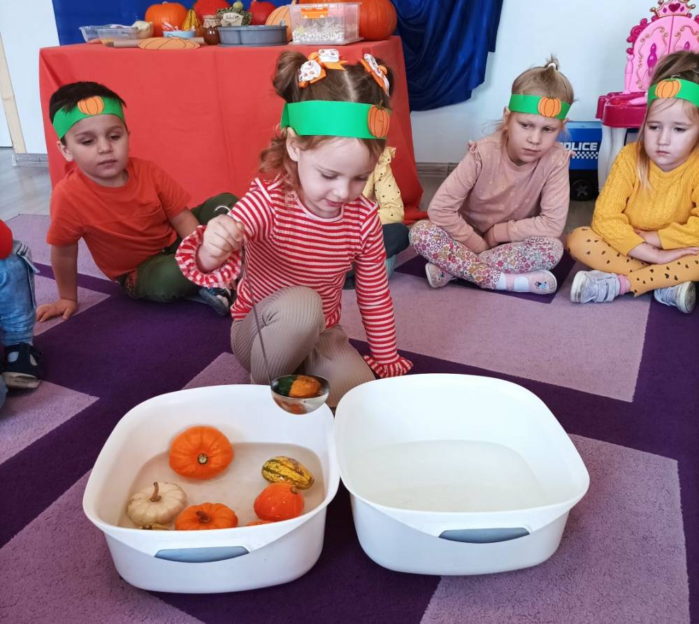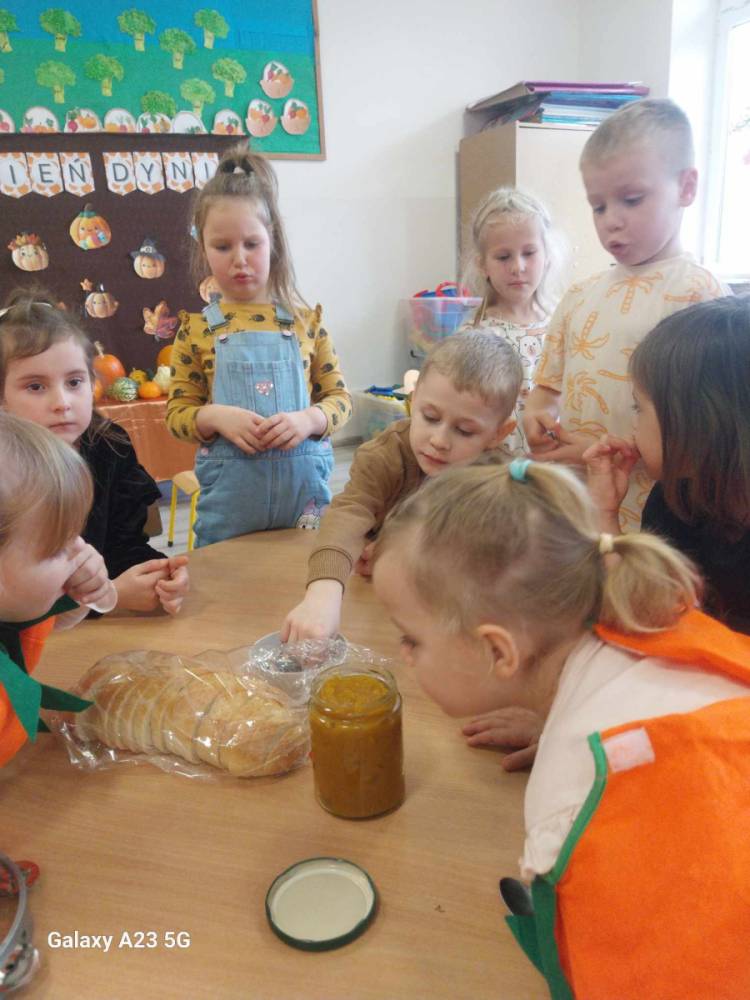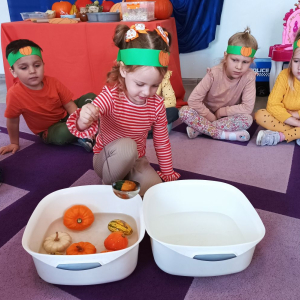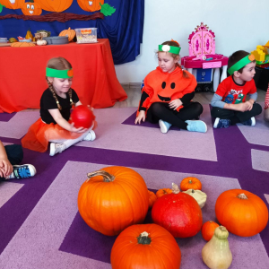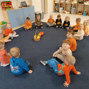 W ostatnim tygodniu października w naszym przedszkolu odbył się „Dzień Dyni”. Była to świetna okazja do poznania wielkiej różnorodności dyń i wzbogacenia wiedzy na ich temat. „Święto Dyni” rozpoczęliśmy wspólnym tańcem oraz rozmową na temat dyni. Dzieci dowiedziały się, że jest ona bardzo zdrowym warzywem i można z niej przygotować wiele smacznych dań. W poszczególnych grupach odbyły się ciekawe zajęcia i zabawy m.in.: pływająca dynia, przeliczanie dyń, szeregowanie od największej do najmniejszej, dyniowy slalom, podaj dynię. Nie zabrakło tańców, śpiewów, zabaw muzyczno-ruchowych oraz kreatywnych prac plastycznych. Dużo radości sprawił dzieciom udział w sesji zdjęciowej w stroju dyni. Zwieńczeniem tego dnia było przygotowanie gofrów i deserów z dyni, które nasze przedszkolaki spałaszowały ze smakiem. Ten dzień przyniósł wiele niezapomnianych wrażeń, ciekawości, odkrywania i zabawy.
