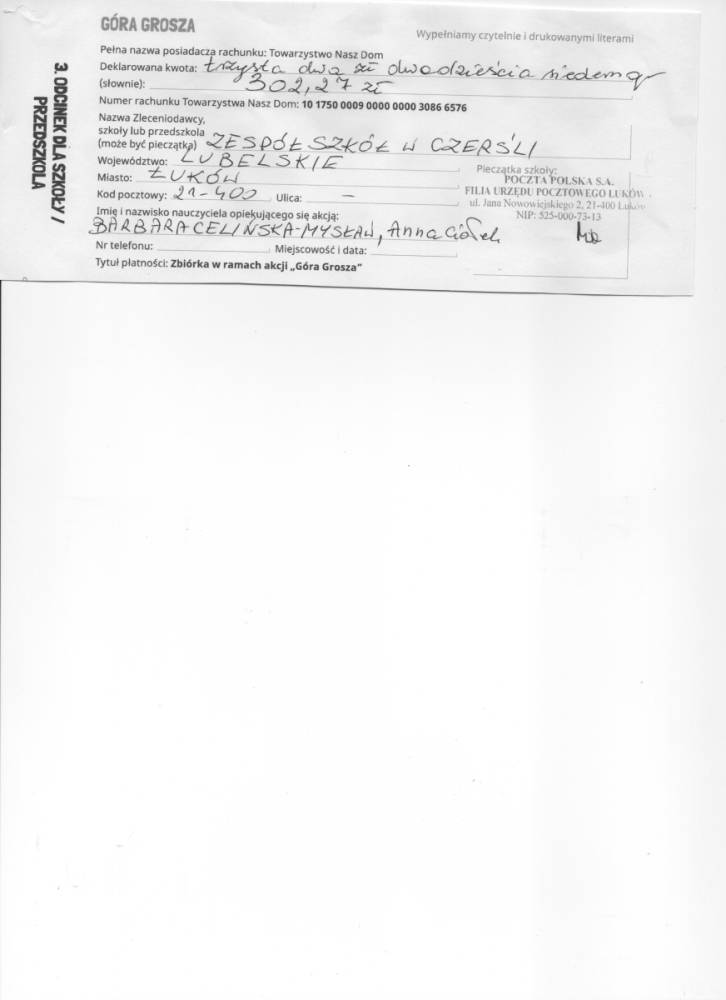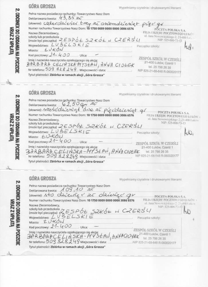 Pieniądze spakowane w 4 paczki - 28 kg zostały dostarczone do punktu Poczta Polska w Łukowie. Organizatorem akcji był SU. Wszystkim dziękujemy za włączenie się do akcji.