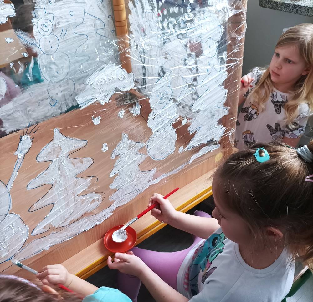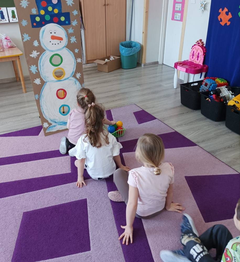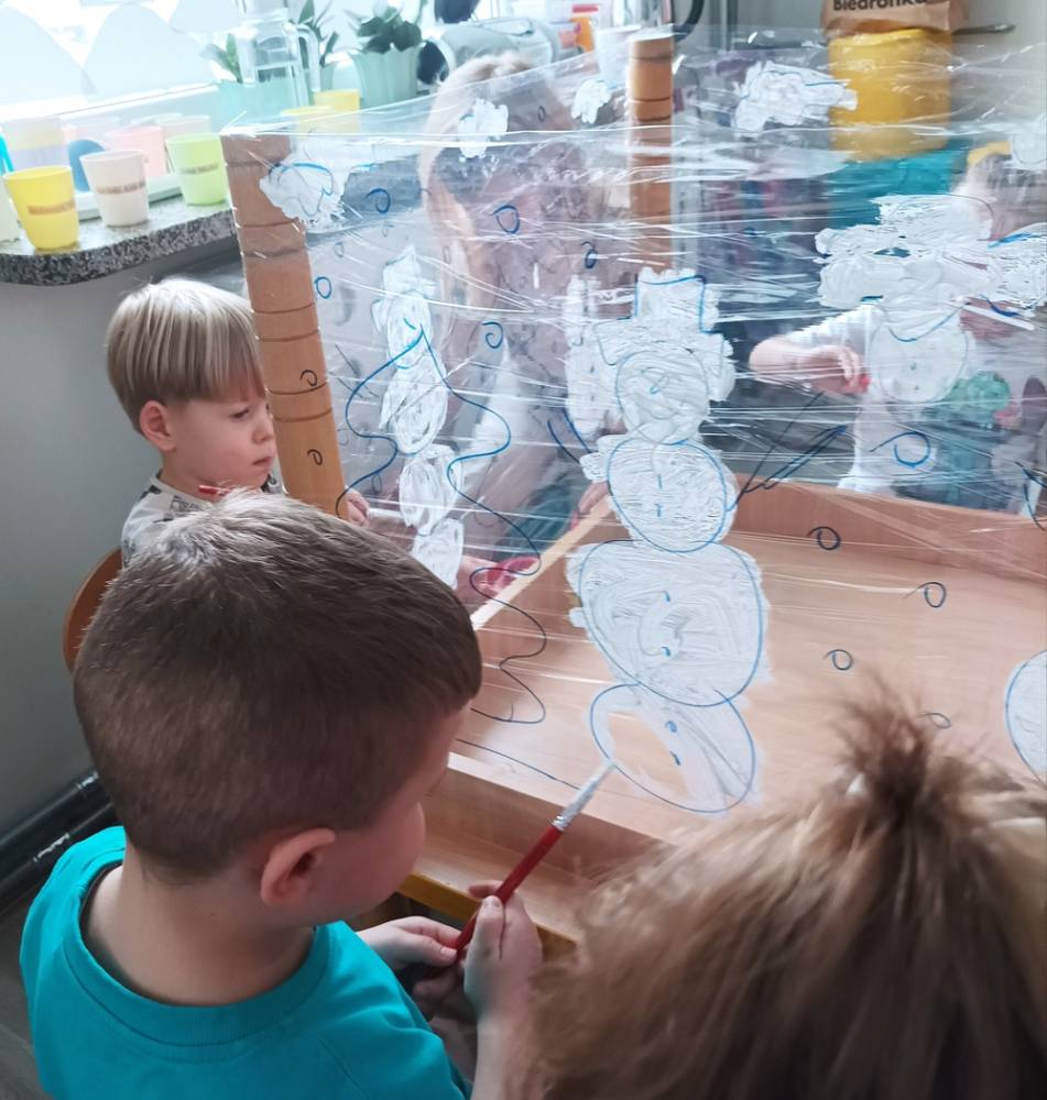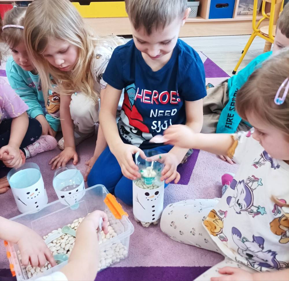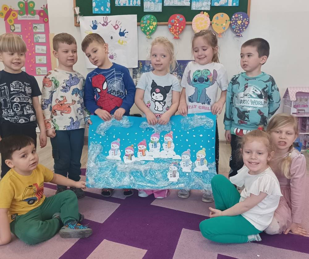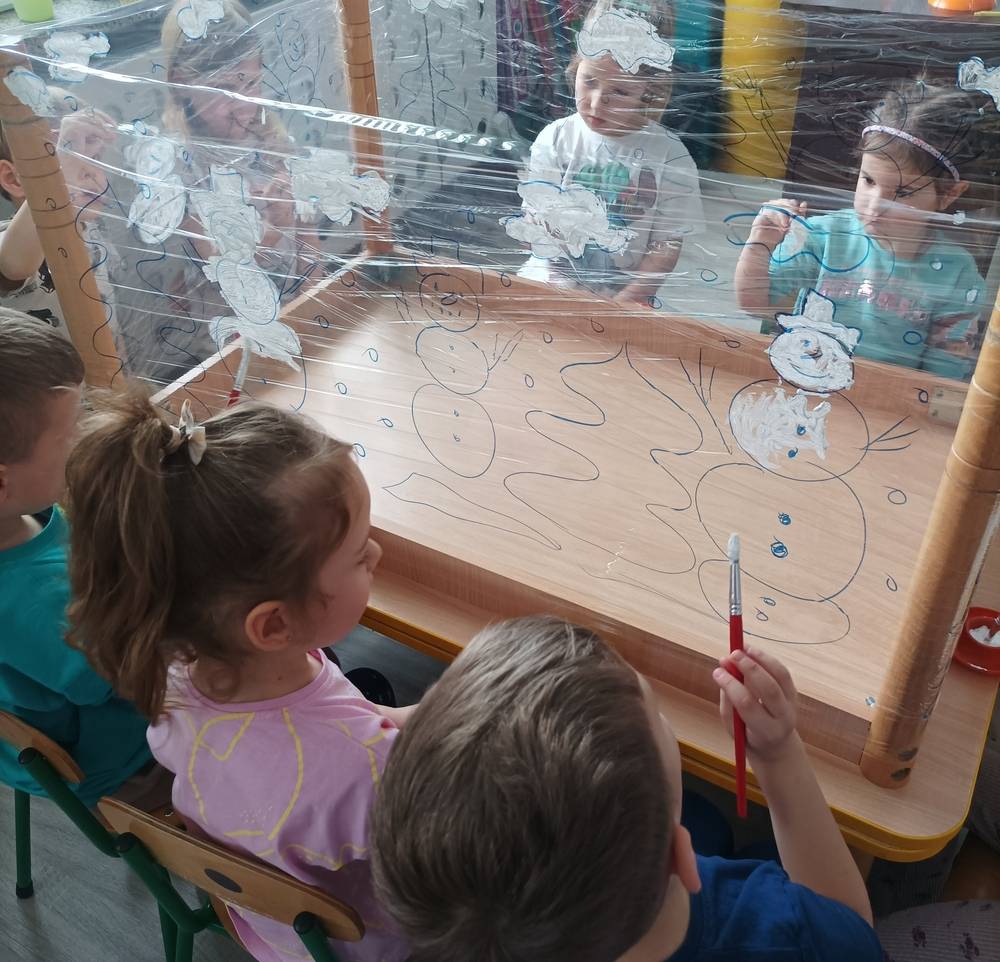 W zimowym cyklu zajęć 4-latki uczestniczyły w sensorycznych zabawach zainspirowanych obecna porą roku – zimą. Za pomocą fasolki wypełniały bałwanki wykonane z plastikowych butelek, malowały zimową krainę na bezbarwnej folii, obserwowały eksperyment w wyniku którego powstał śniegowy bałwanek. „Motylki” wykonały wiele zimowych prac z wykorzystaniem różnorodnych materiałów: folii, brokatu, waty itp. Dzięki powyższym działaniom przedszkolaki rozwijały zmysł wzroku, dotyku, kształtowały koordynację wzrokowo-ruchową, motorykę małą, przy tym świetnie się bawiąc.