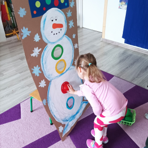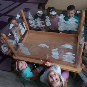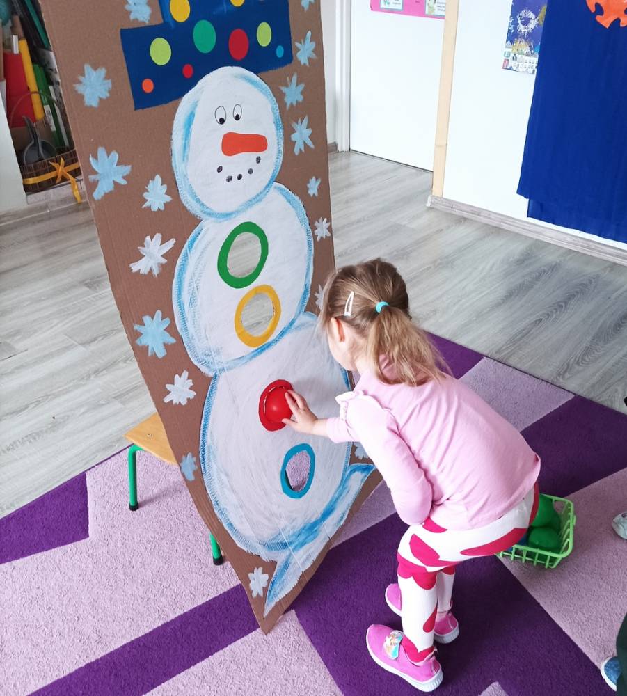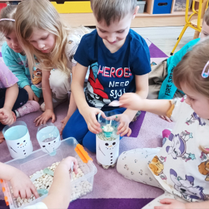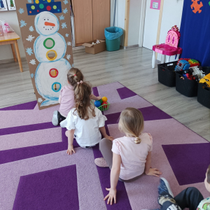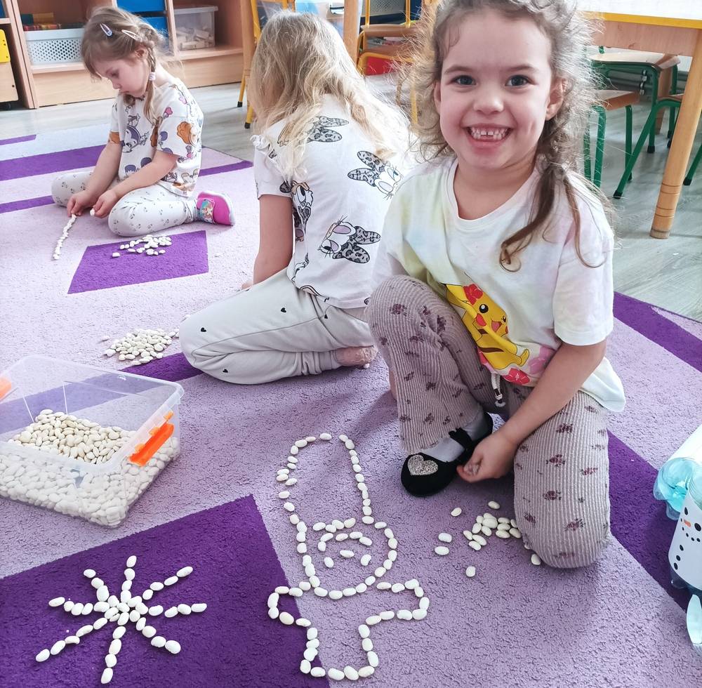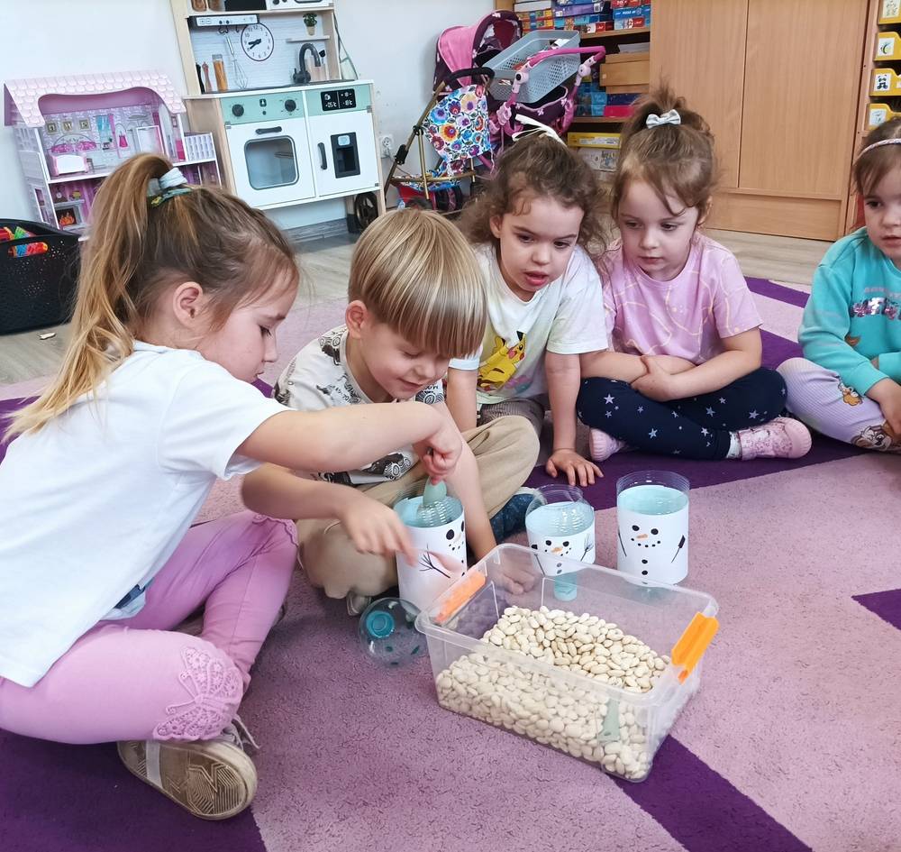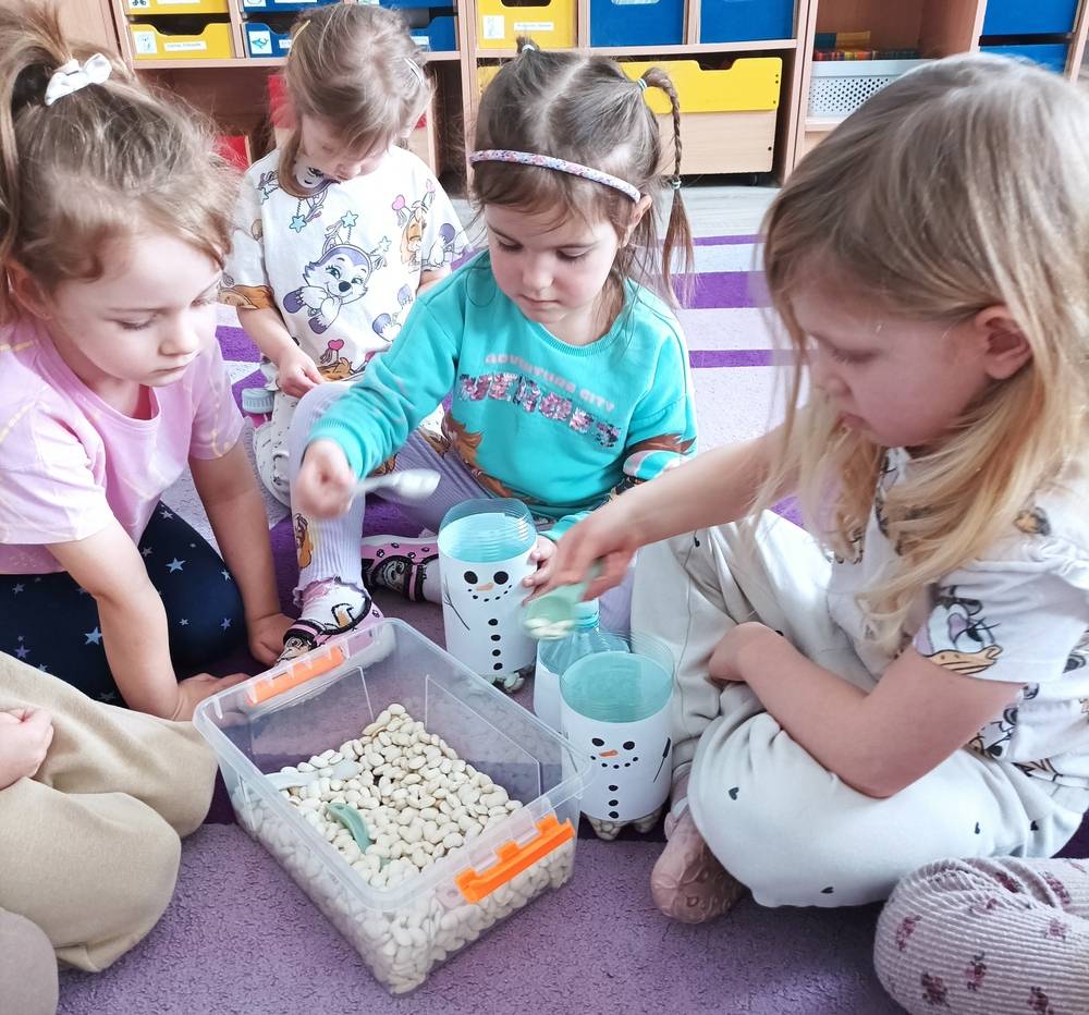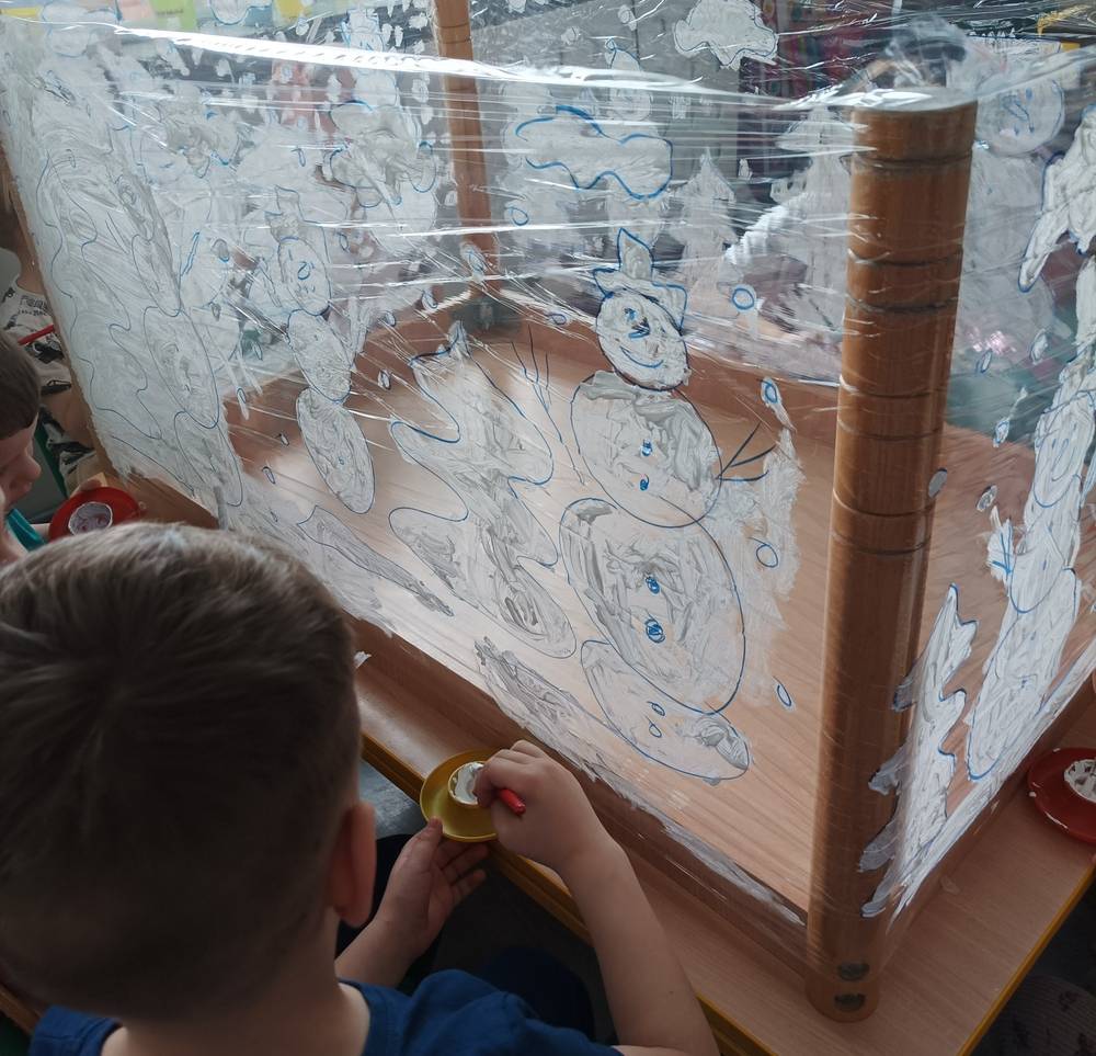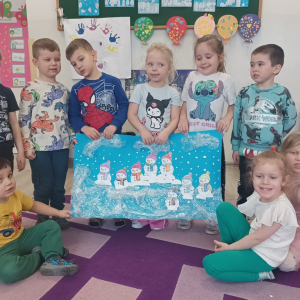 W zimowym cyklu zajęć 4-latki uczestniczyły w sensorycznych zabawach zainspirowanych obecna porą roku – zimą. Za pomocą fasolki wypełniały bałwanki wykonane z plastikowych butelek, malowały zimową krainę na bezbarwnej folii, obserwowały eksperyment w wyniku którego powstał śniegowy bałwanek. „Motylki” wykonały wiele zimowych prac z wykorzystaniem różnorodnych materiałów: folii, brokatu, waty itp. Dzięki powyższym działaniom przedszkolaki rozwijały zmysł wzroku, dotyku, kształtowały koordynację wzrokowo-ruchową, motorykę małą, przy tym świetnie się bawiąc.