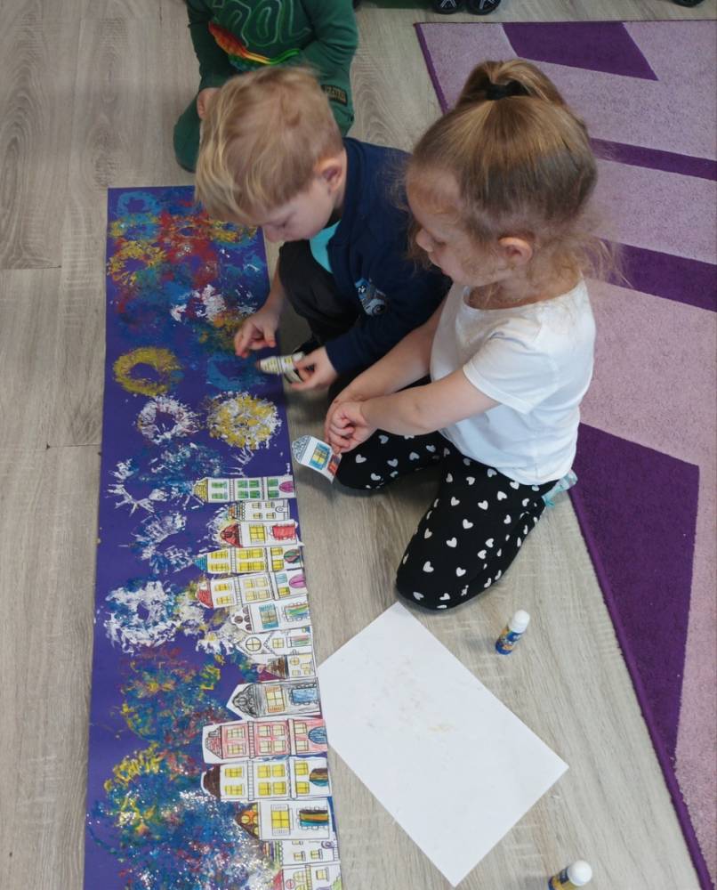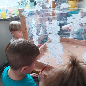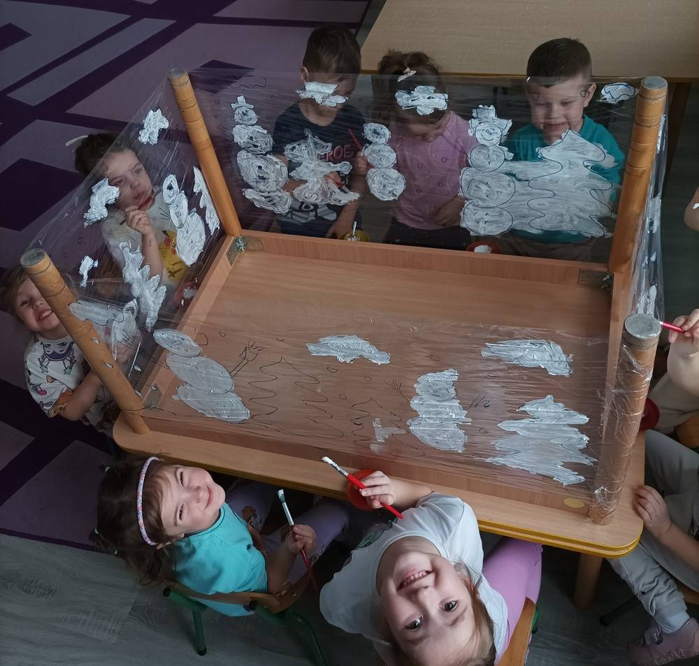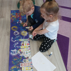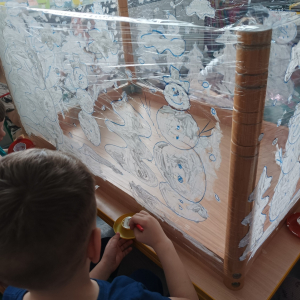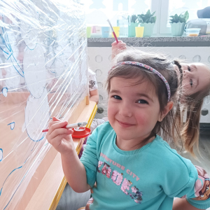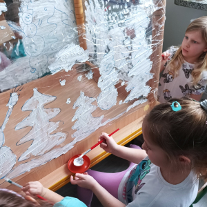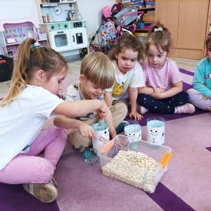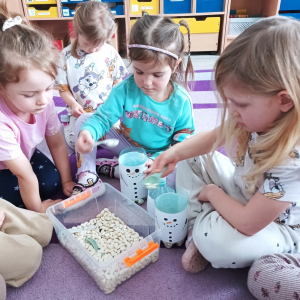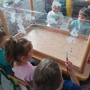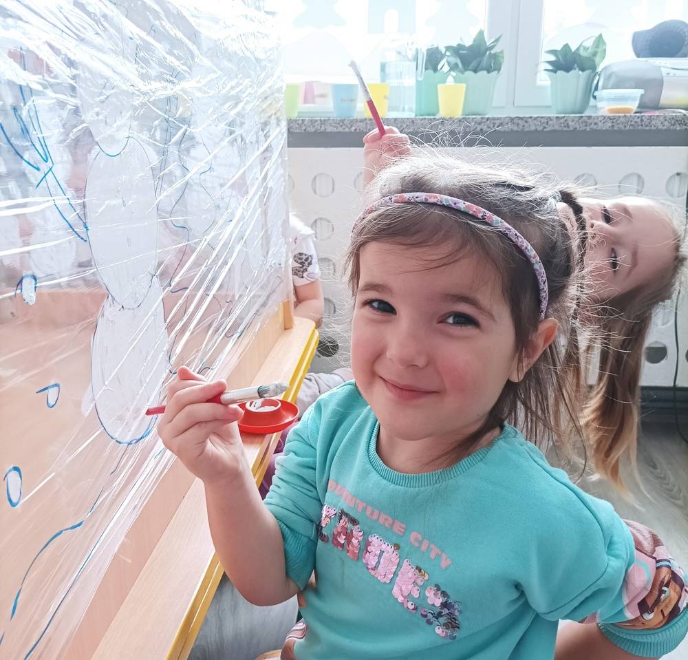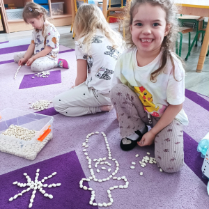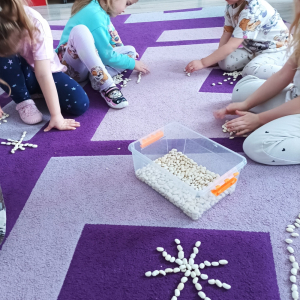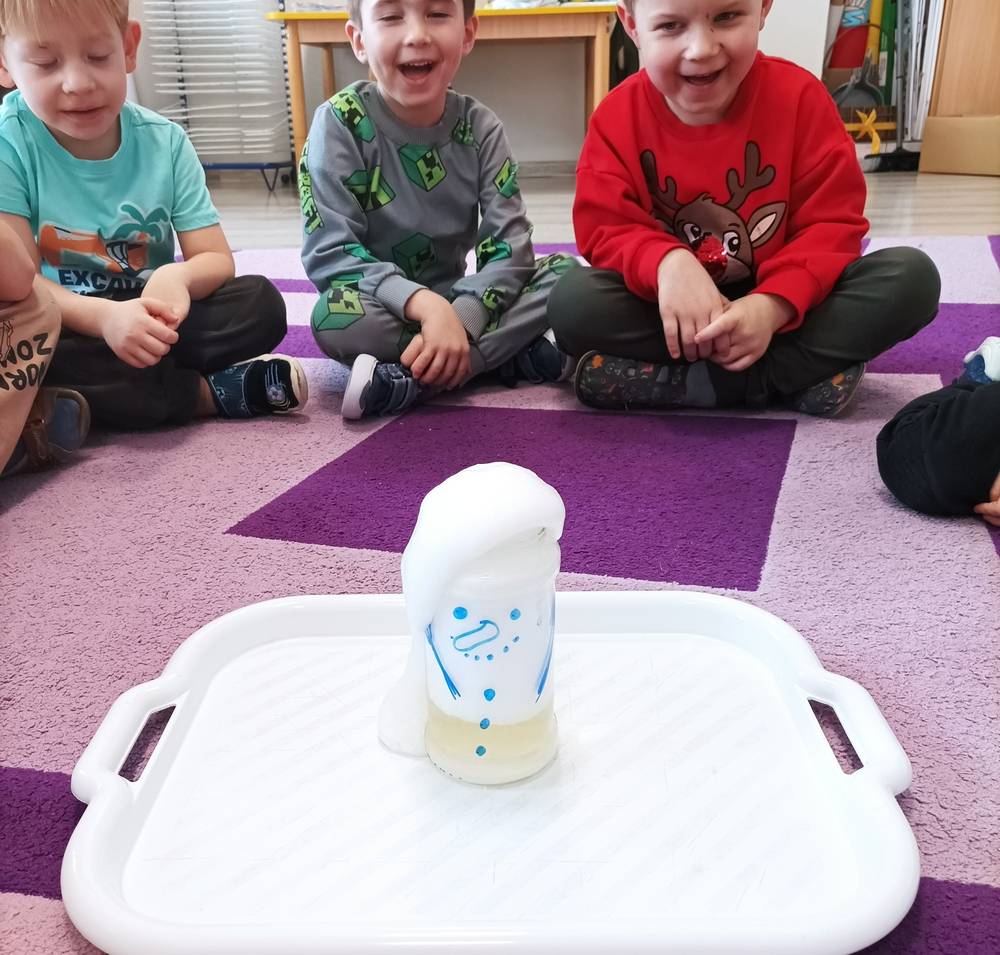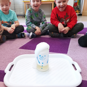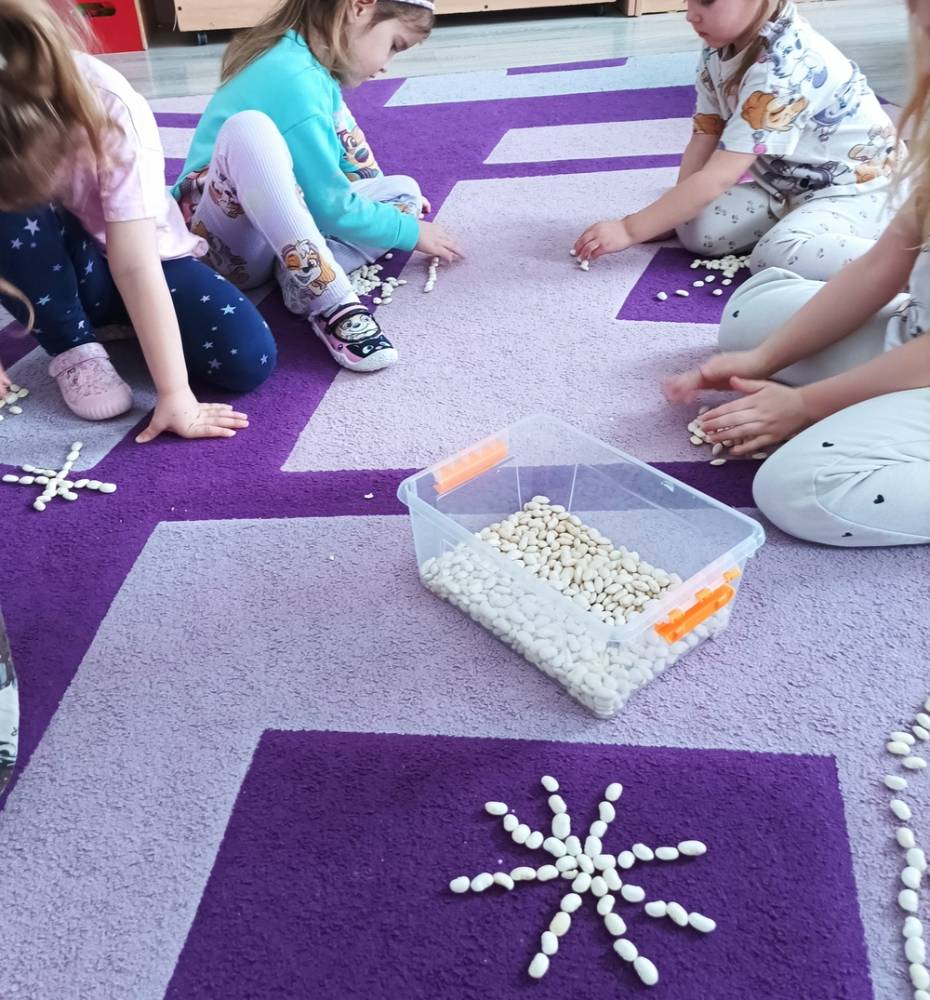 W zimowym cyklu zajęć 4-latki uczestniczyły w sensorycznych zabawach zainspirowanych obecna porą roku – zimą. Za pomocą fasolki wypełniały bałwanki wykonane z plastikowych butelek, malowały zimową krainę na bezbarwnej folii, obserwowały eksperyment w wyniku którego powstał śniegowy bałwanek. „Motylki” wykonały wiele zimowych prac z wykorzystaniem różnorodnych materiałów: folii, brokatu, waty itp. Dzięki powyższym działaniom przedszkolaki rozwijały zmysł wzroku, dotyku, kształtowały koordynację wzrokowo-ruchową, motorykę małą, przy tym świetnie się bawiąc.