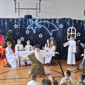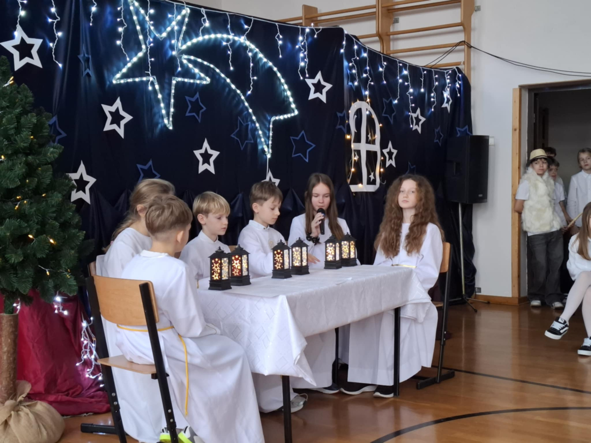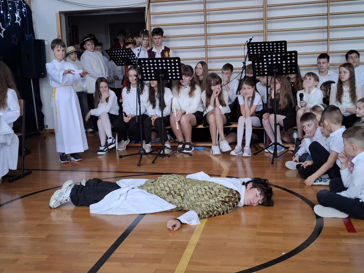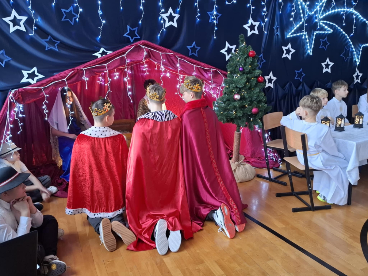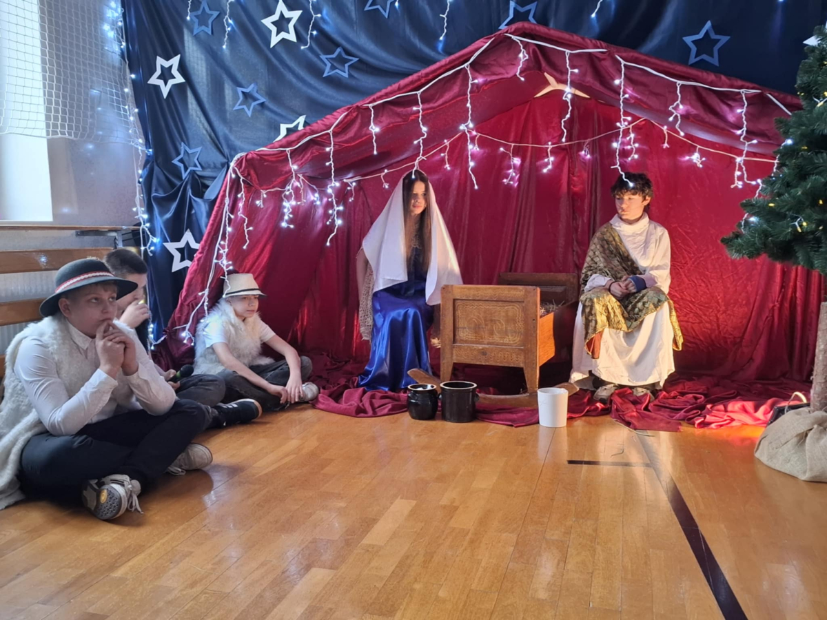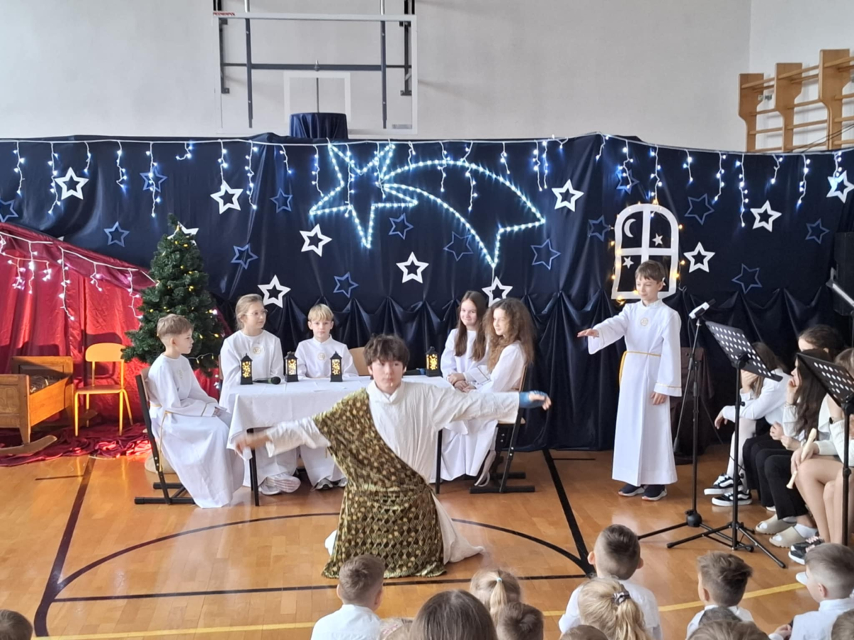 18 grudnia w naszej szkole odbyły się wyjątkowe jasełka bożonarodzeniowe, przygotowane przez uczniów klas 4–8. Młodzi artyści z wielkim zaangażowaniem zaprezentowali historię narodzin Jezusa, wprowadzając widzów w świąteczny nastrój. Przedstawienie uświetniły piękne kolędy śpiewane przez chór, starannie przygotowane stroje i rekwizyty oraz nastrojowa scenografia.