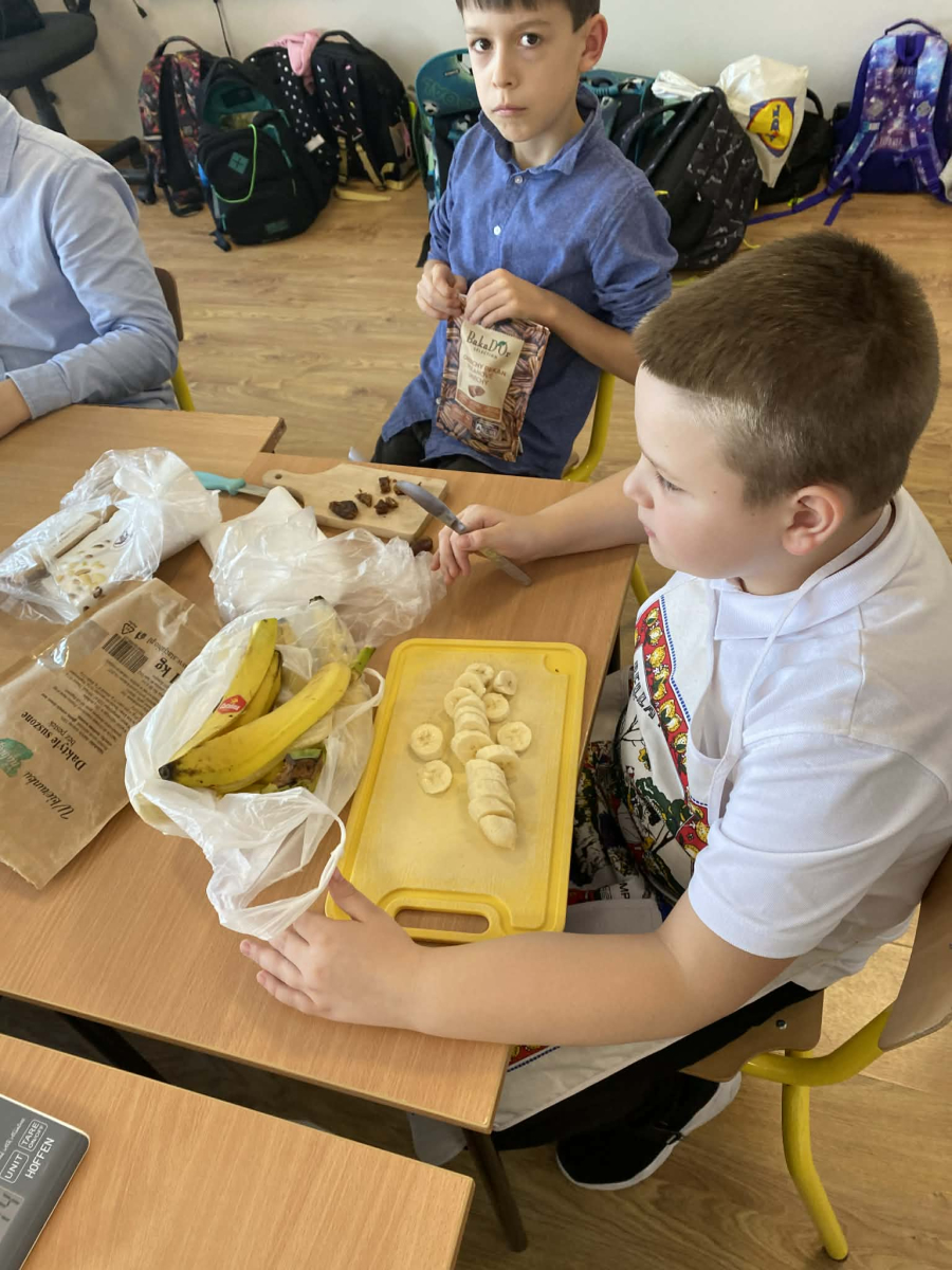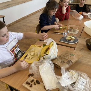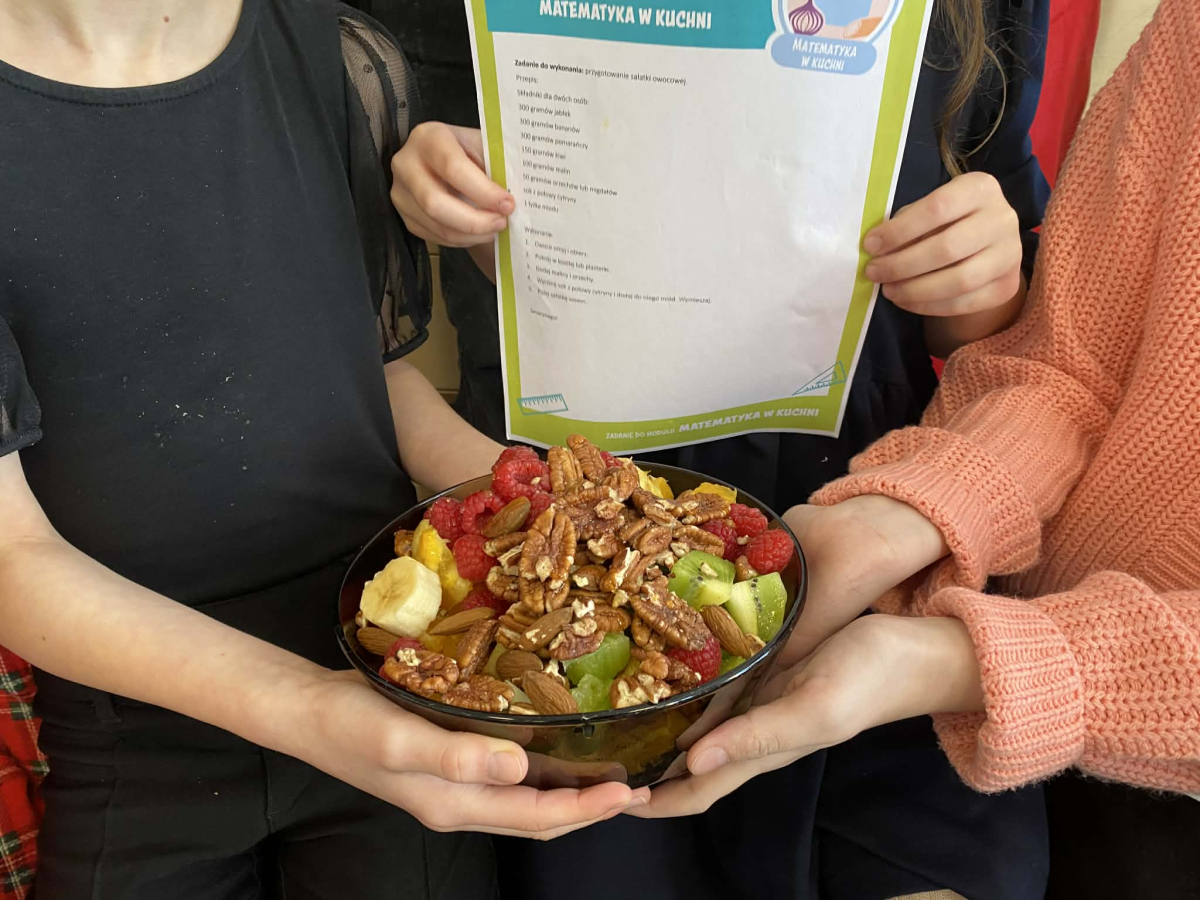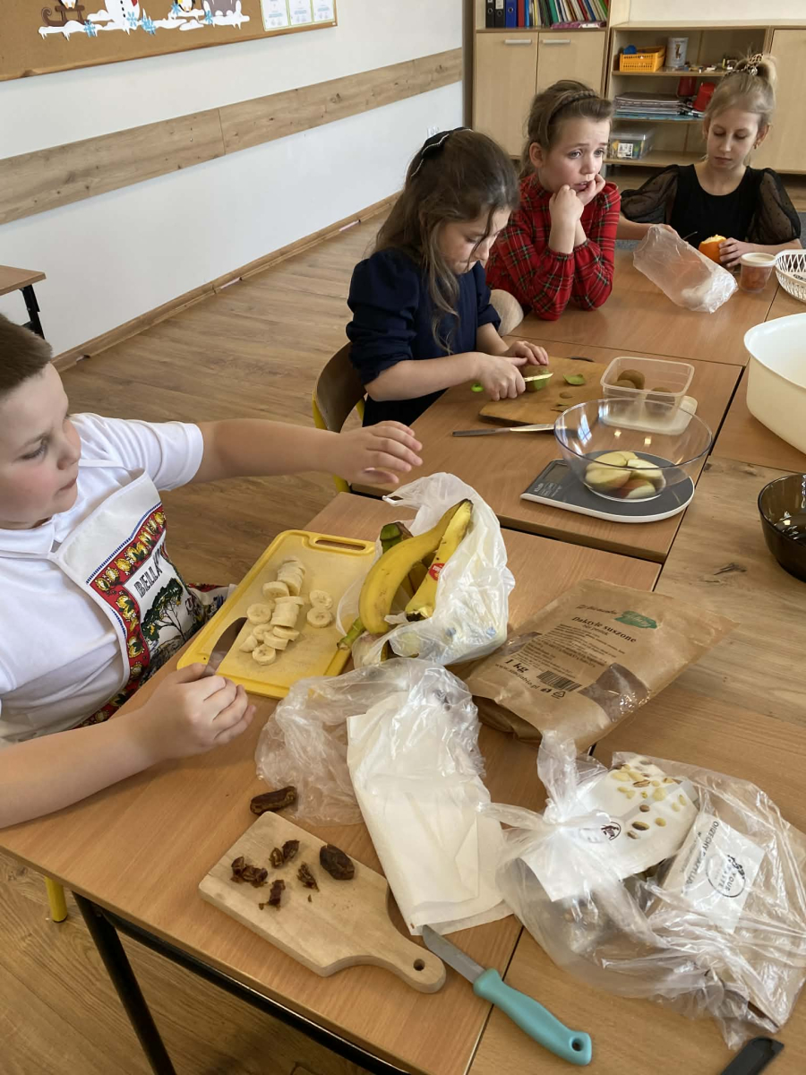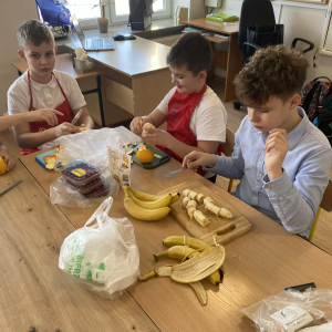 Tym razem w ramach modułu „Matematyka w kuchni” dzieci miały za zadanie przygotować sałatkę owocową według ściśle określonego przepisu, wykorzystując wagę kuchenną. Zadanie polegało na praktycznym zastosowaniu umiejętności zamiany jednostek masy – z kilogramów na gramy. Uczniowie świetnie poradzili sobie z tym wyzwaniem, wykazując się dużym zaangażowaniem i dokładnością. Aktywnie uczestniczyli w przygotowaniach, a na zakończenie z apetytem zjedli samodzielnie wykonaną sałatkę owocową.