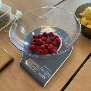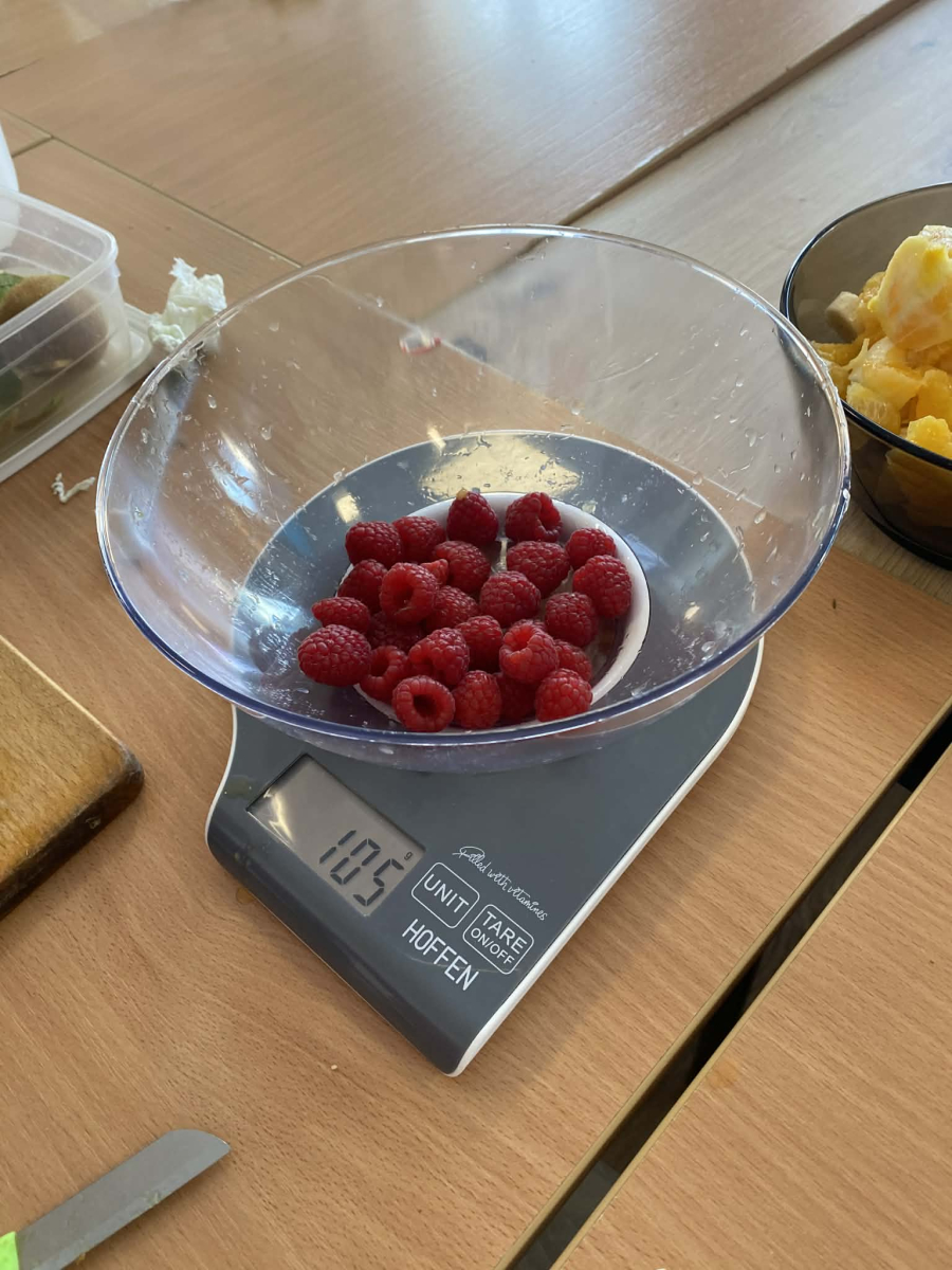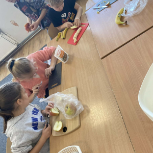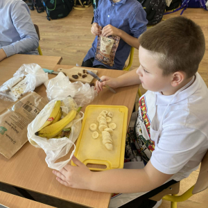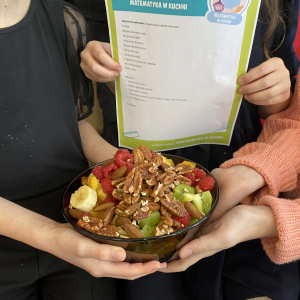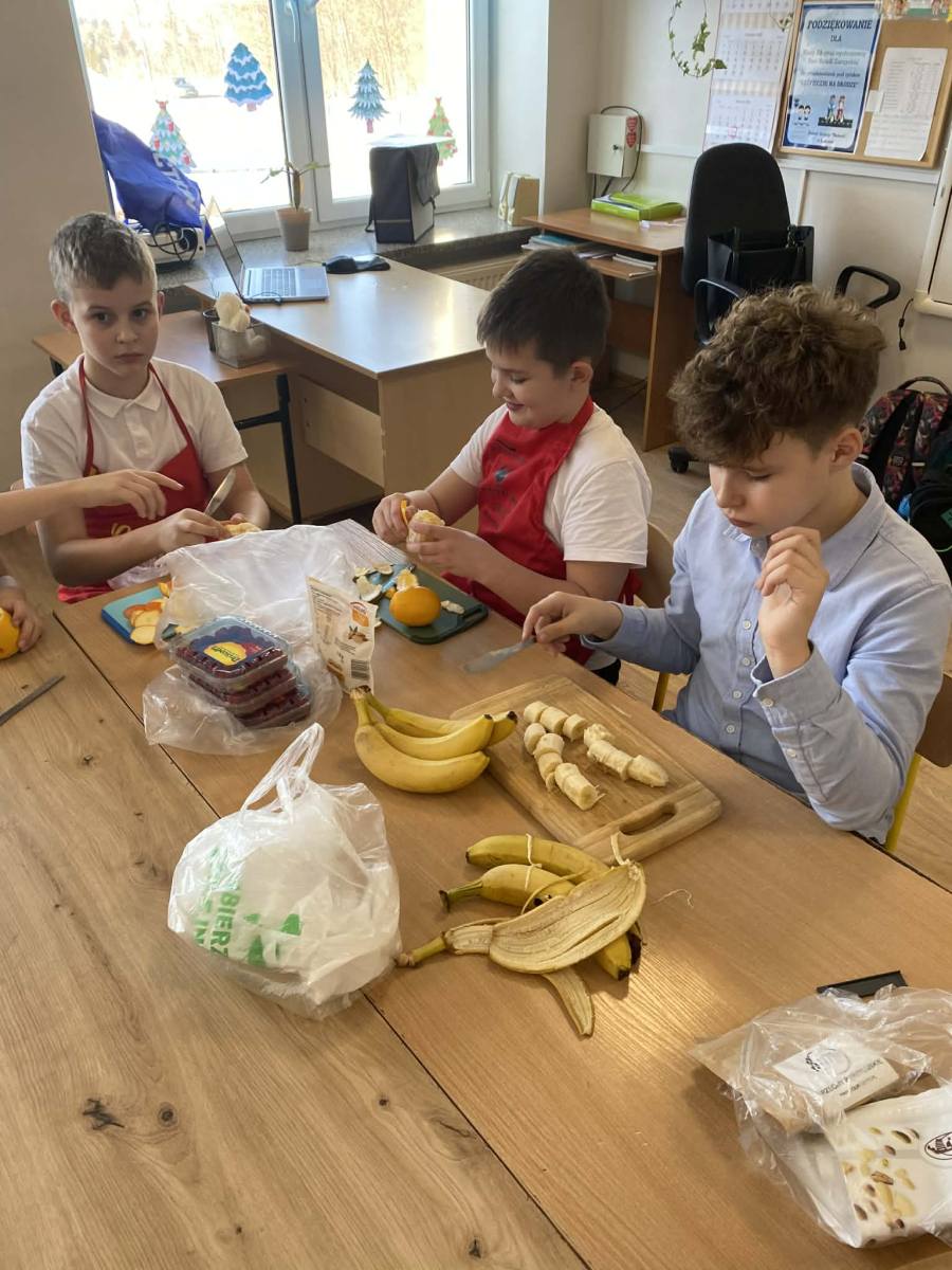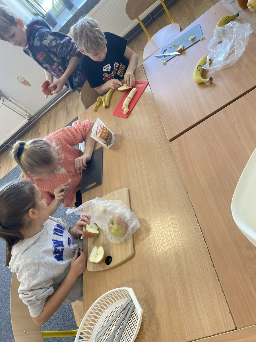 Tym razem w ramach modułu „Matematyka w kuchni” dzieci miały za zadanie przygotować sałatkę owocową według ściśle określonego przepisu, wykorzystując wagę kuchenną. Zadanie polegało na praktycznym zastosowaniu umiejętności zamiany jednostek masy – z kilogramów na gramy. Uczniowie świetnie poradzili sobie z tym wyzwaniem, wykazując się dużym zaangażowaniem i dokładnością. Aktywnie uczestniczyli w przygotowaniach, a na zakończenie z apetytem zjedli samodzielnie wykonaną sałatkę owocową.