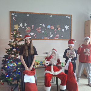 Na korytarzach i w salach zawisły świąteczne dekoracje, a uczniowie i nauczyciele pojawili się w mikołajkowych strojach. Wszyscy z utęsknieniem nasłuchiwali dzwonków zapowiadających przybycie wyjątkowego Gościa. Jak co roku zawitał do nas Święty Mikołaj!!!