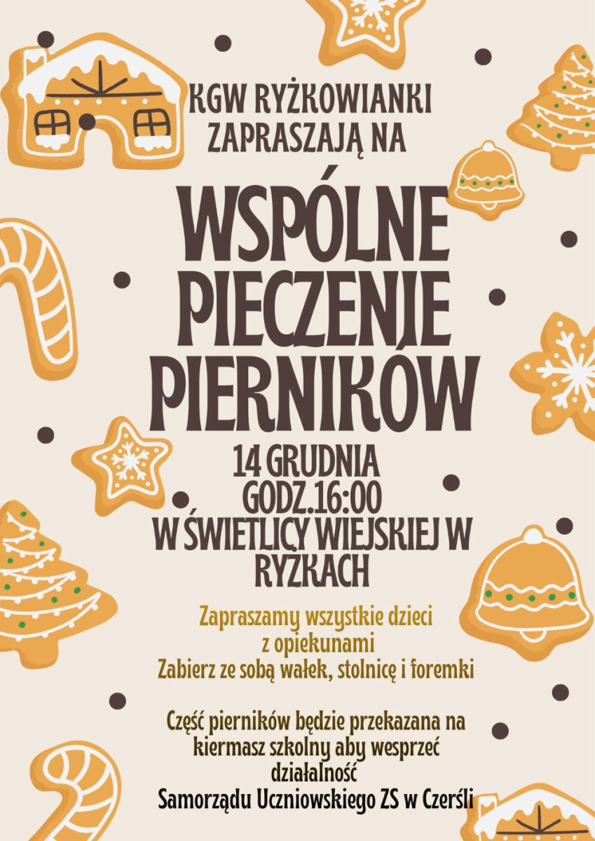 14 grudnia 2025 r. panie z Koła Gospodyń Wiejskich z Ryżek „Ryżkowianki” poprowadziły warsztaty dla dzieci z naszej szkoły. Wspólnie upiekli aromatyczne przysmaki, które zostały przekazane na wsparcie działalności Samorządu Uczniowskiego ZS w Czerśli.