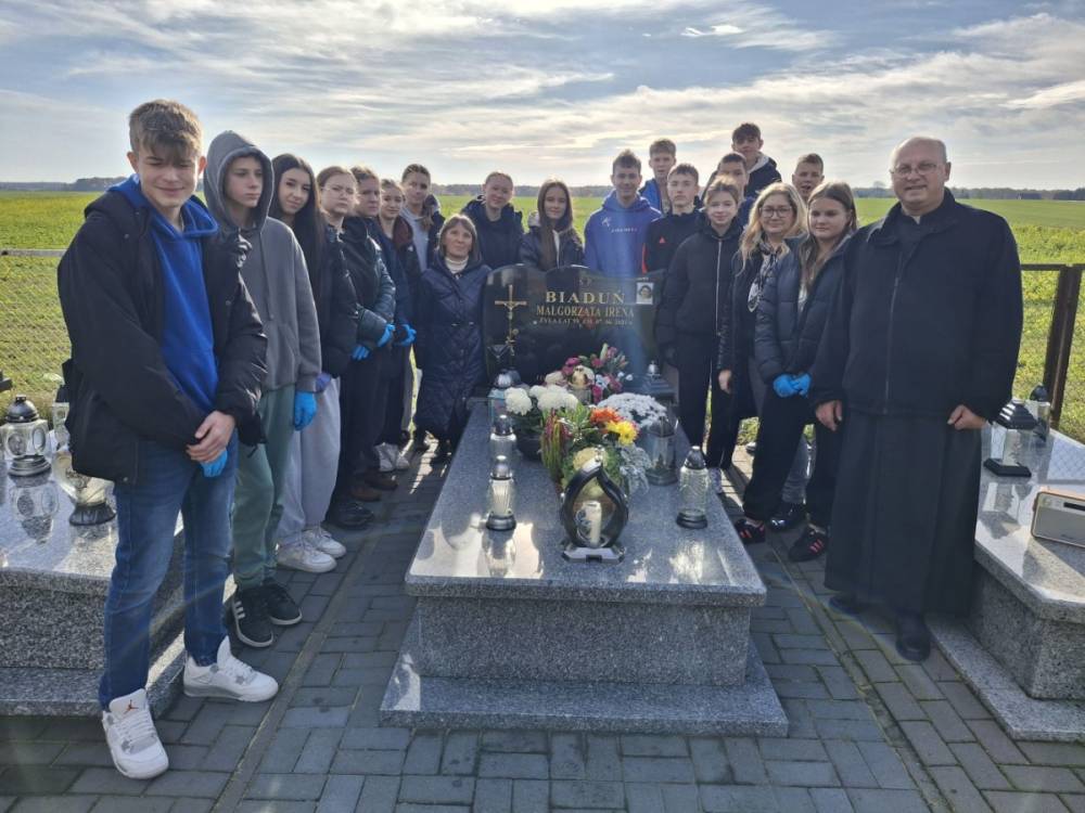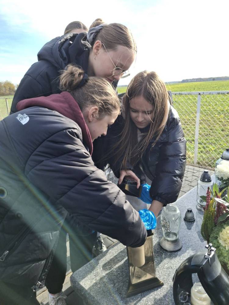 Mieszkańcy wioski wskazali nam również mogiły nauczycieli z Tajnych Kompletów z czasów okupacji, gdzie posprzątaliśmy i zapaliliśmy światełko naszej pamięci. Zaangażowanie naszej młodzieży docenił Proboszcz parafii w Jeleńcu, który podziękował uczniom za obecność i pomoc.