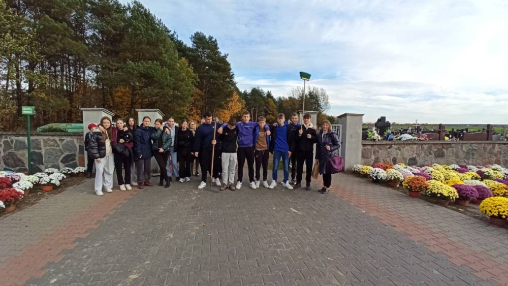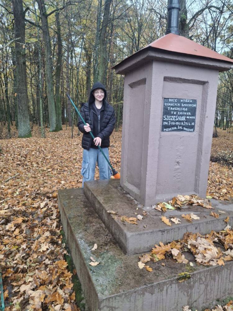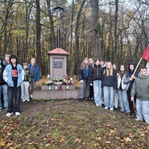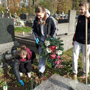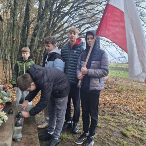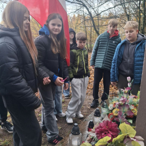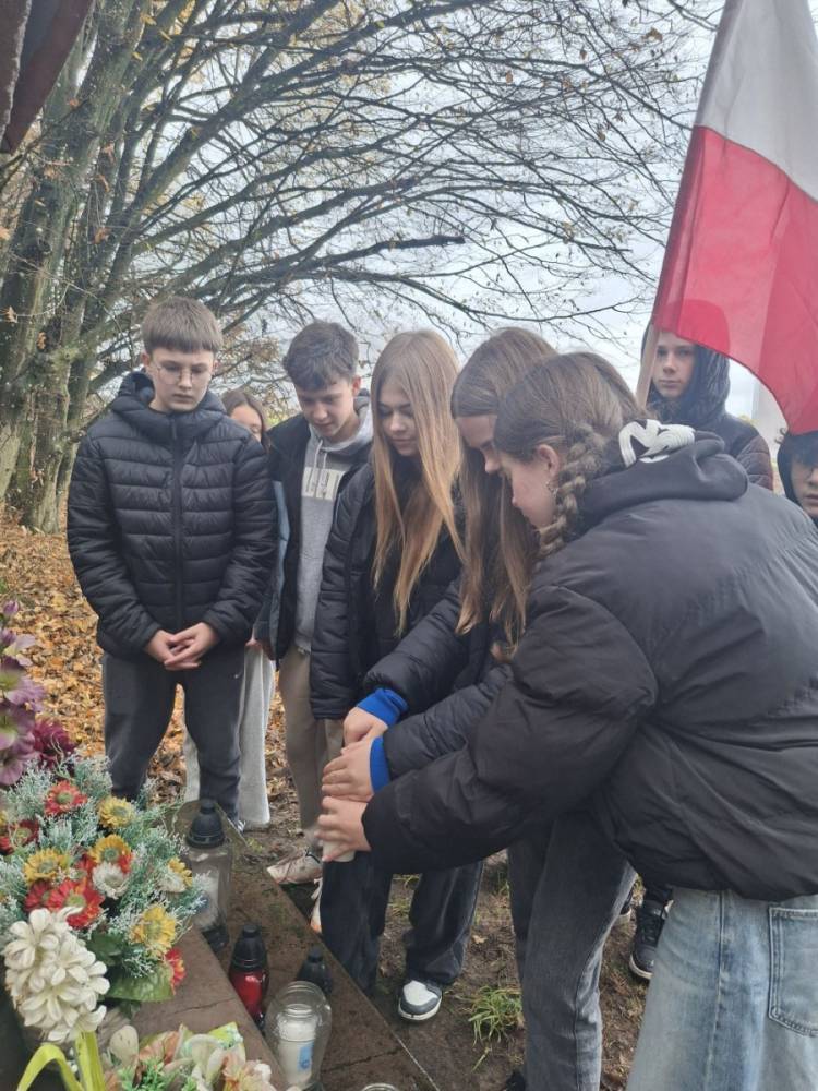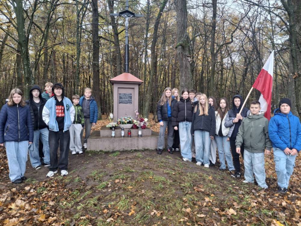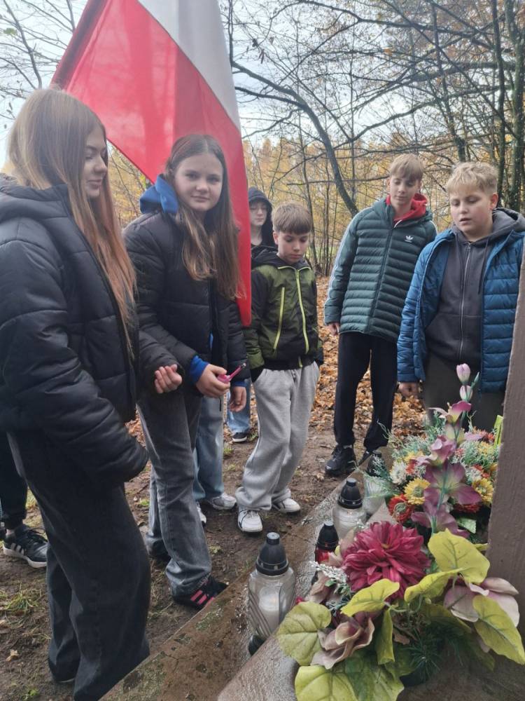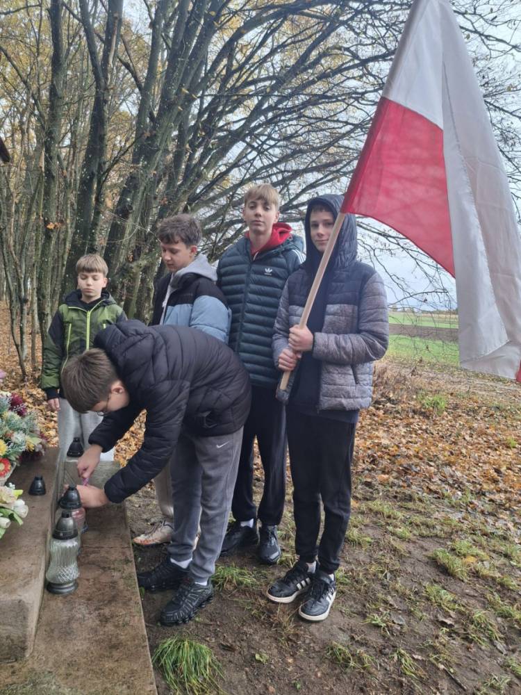 28 października na godzinie wychowawczej uczniowie klasy 7. wraz z wychowawczynią udali się do pobliskiego grobu młodego chłopaka, który poniósł śmierć w czasie II wojny światowej. Siódmoklasiści zadbali o porządek wokół pomnika i zapalili symboliczne znicze. W zadumie i chwili ciszy oddali pamięć wszystkim ofiarom wojny.