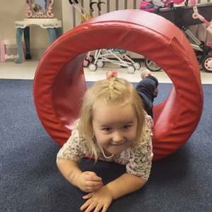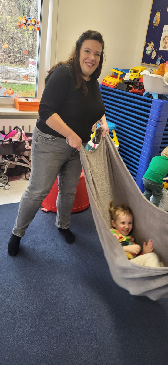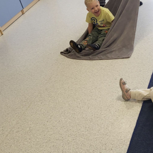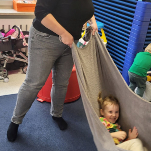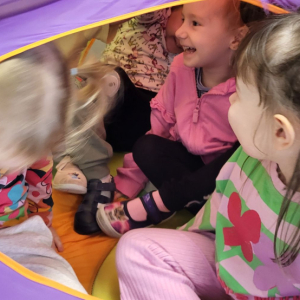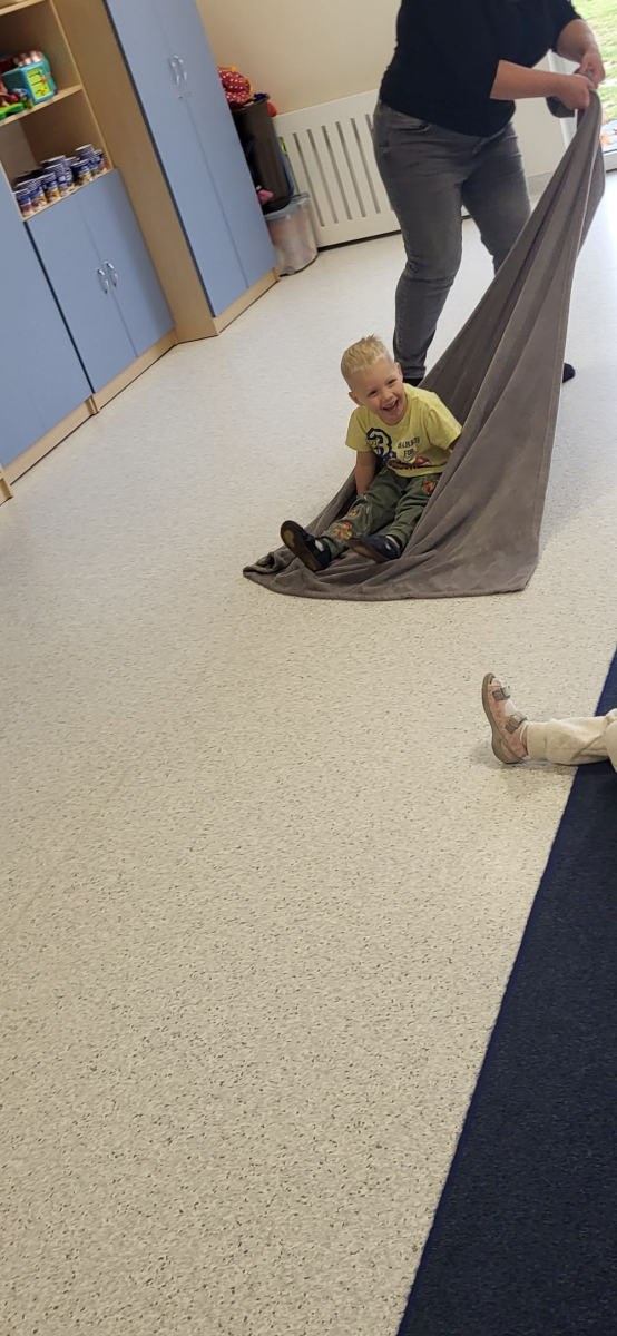 Na uczestników czekały tory przeszkód, które trzeba było pokonać, skacząc, czołgając się i przeciskając jak prawdziwi mali odkrywcy. Ogromnym hitem okazała się zabawa w naleśnika – dzieci były zawijane w koc i solidnie „dociskane”, następnie odwijane na mięciutkim materacu, co dostarczyło mnóstwo radości i bodźców czucia głębokiego. Nie zabrakło też skakania, a także bujania i ciągania w kocu, które wywoływały salwy śmiechu i okrzyki „jeszcze!”.