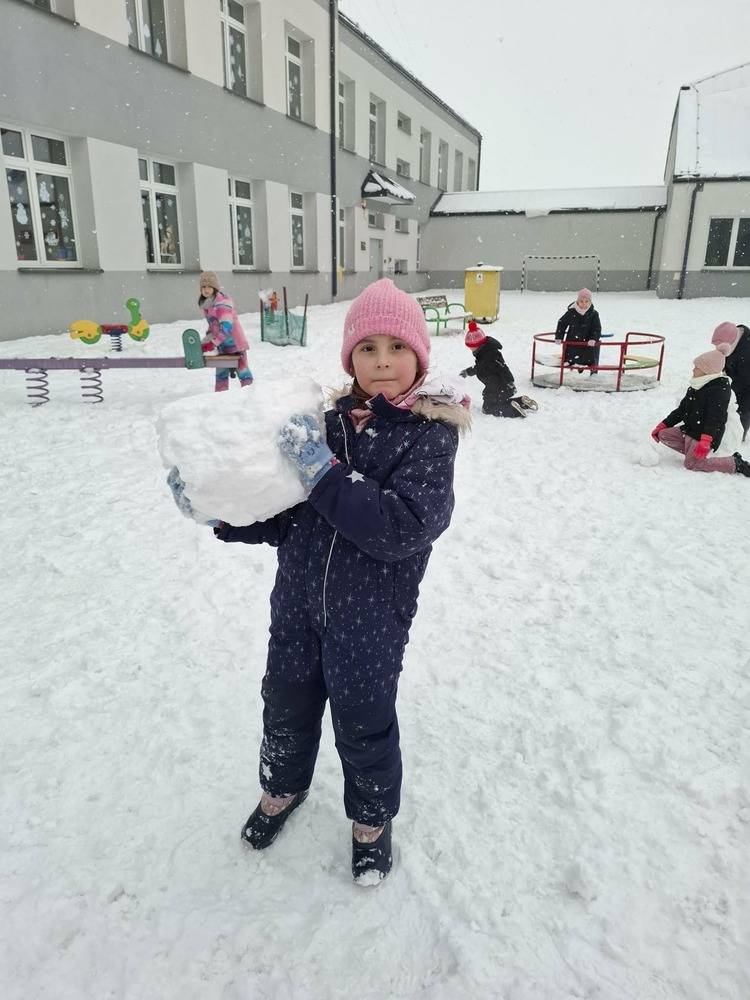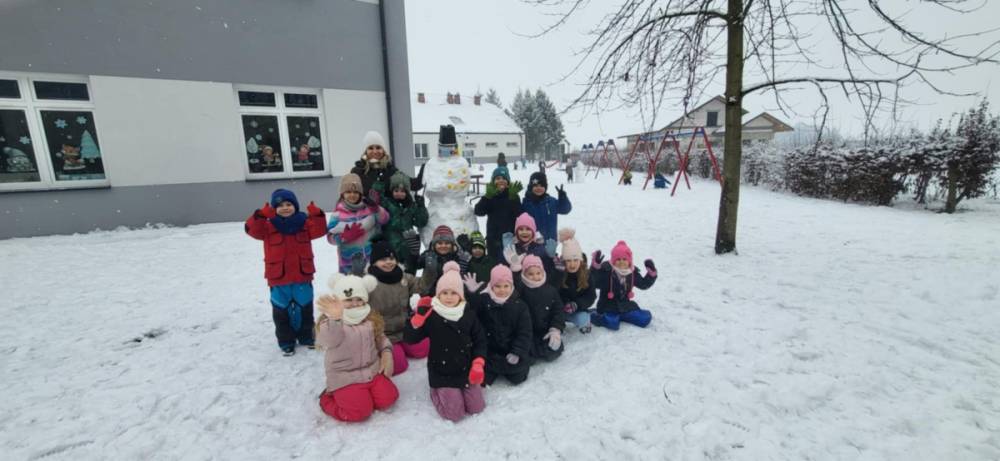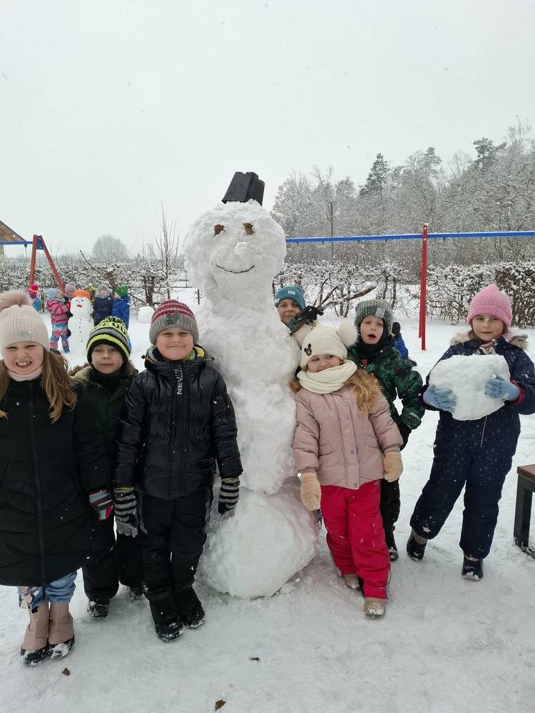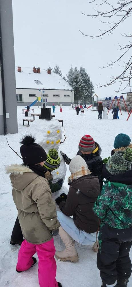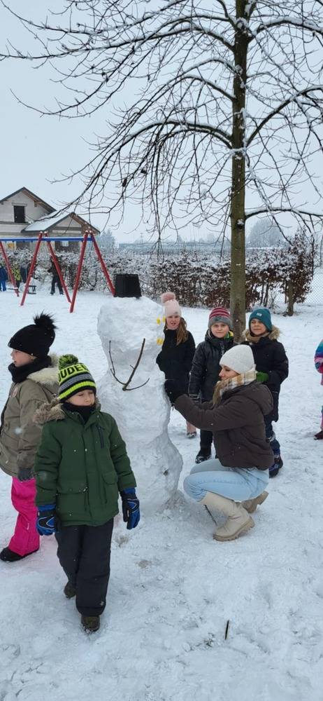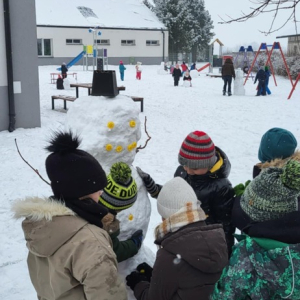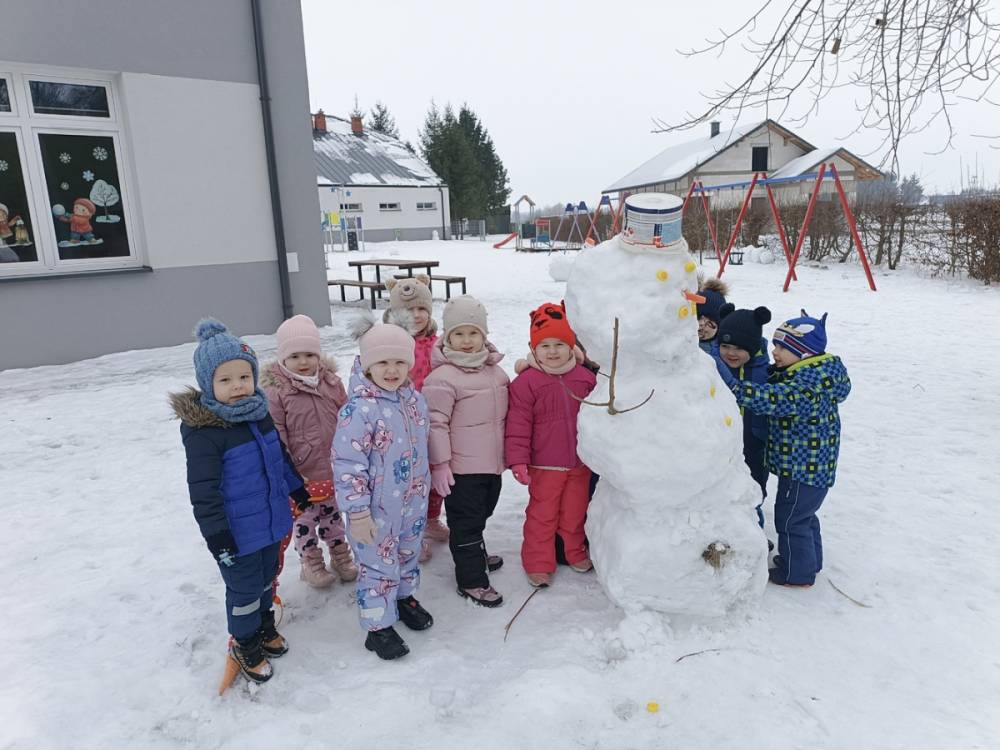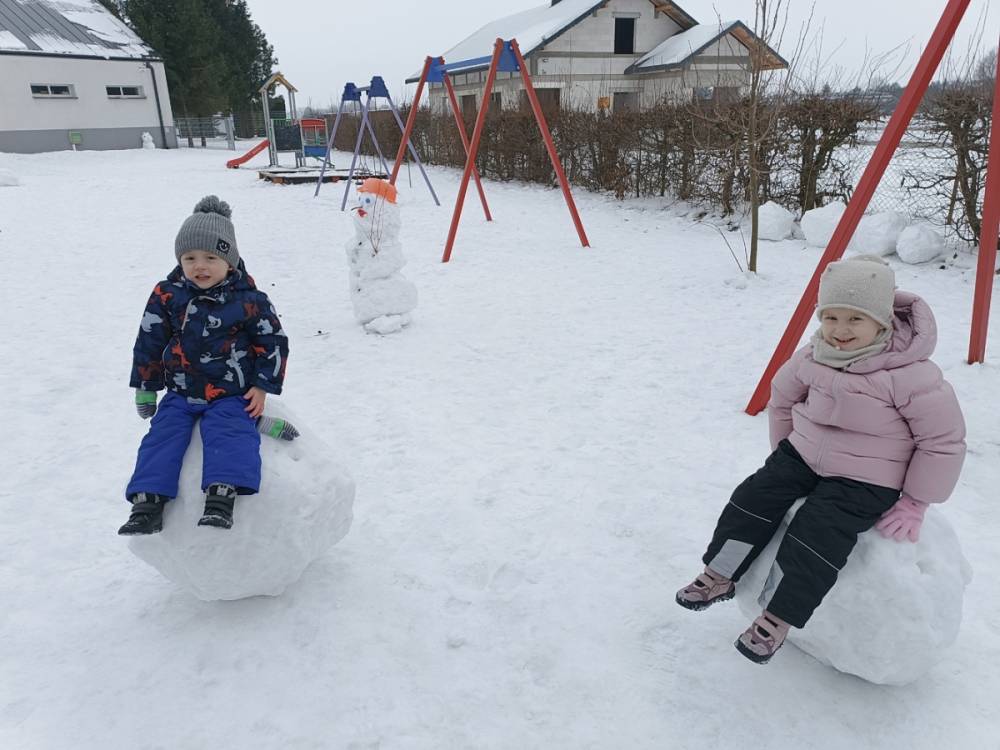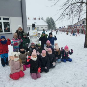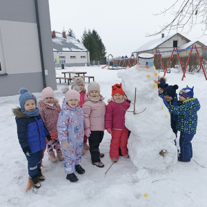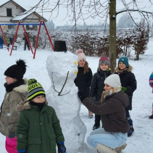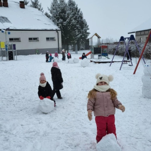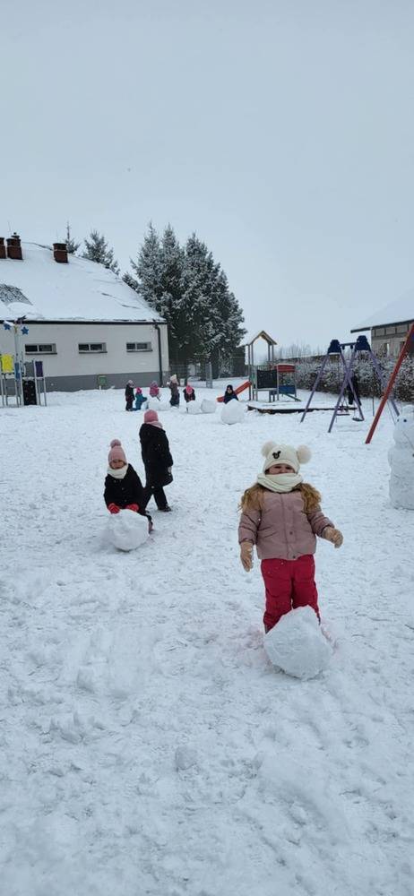 Przedszkolaki z wielkim zaangażowaniem lepiły bałwany, tworząc prawdziwe śnieżne dzieła sztuki. Nie zabrakło śmiechu, współpracy i pozytywnej energii. Zabawy na śniegu sprawiły wszystkim wiele radości, a jednocześnie były świetnym sposobem na zdrowy ruch i kontakt z naturą.